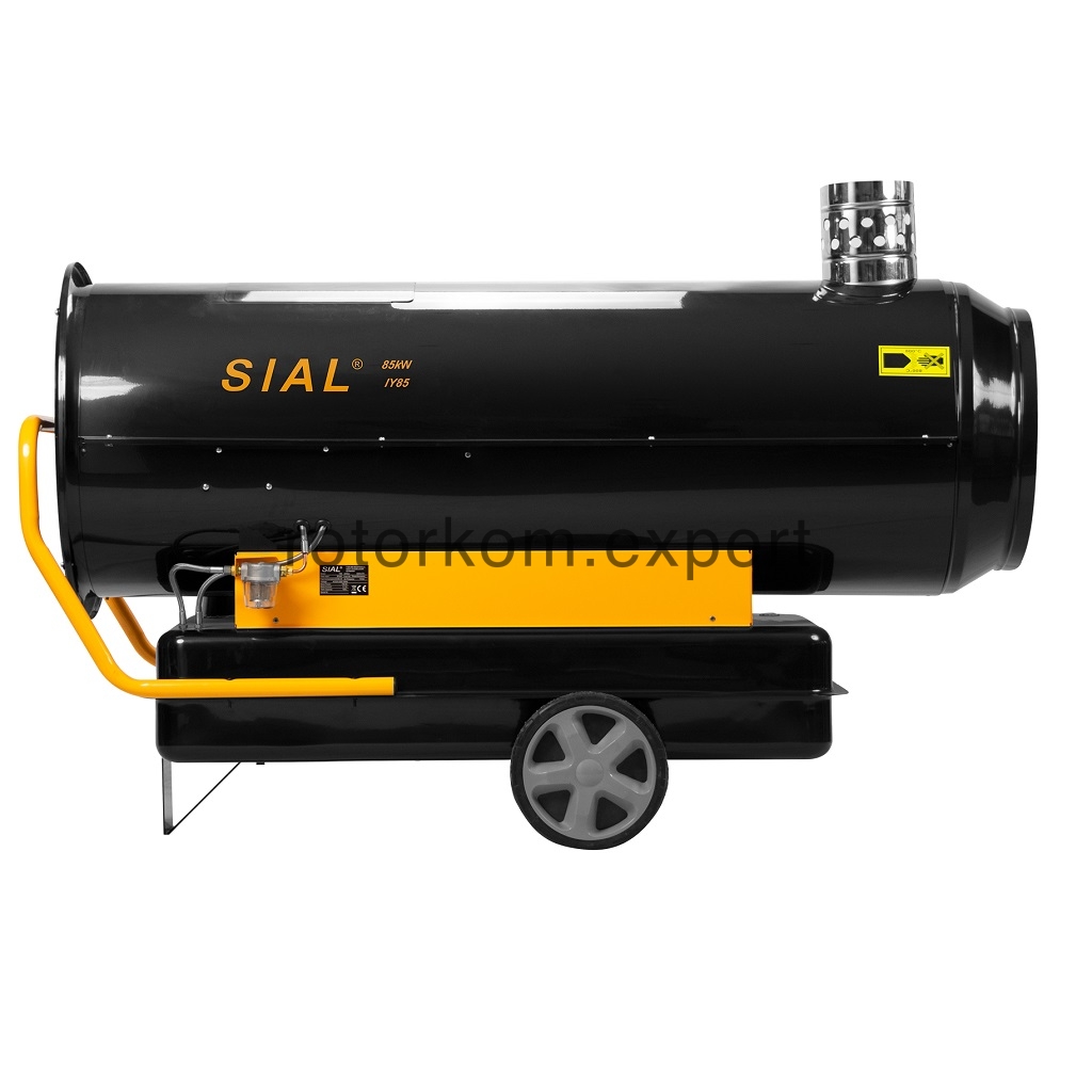 Дизельная тепловая пушка SIAL IY 85 - эффективный дизельный отопитель промышленного класса непрямого нагрева. Передвижения тепловая пушка на колесах демонстрирует большую мощность при высокой производительности и способна прогревать помещения площадью 700–900 м2 более 12 часов на одной заправке. Встроенный термостат делает модель наиболее подходящей для внутреннего монтажа с проектированием дымоходной системы отвода продуктов горения топлива. Для управления температурой выведено два цифровых дисплея. Электронный контрольный модуль, используемый в тепловых пушках, обеспечивает мониторинг за пламенем, автоматическое отключение горения в случае перегрева и регулирование начальных и конечных этапов работы устройства в зависимости от данных термостата. Достоинством непрямого нагрева является разделение потоков, то есть, все вредные выхлопы уходят в дымовой патрубок, а через переднее сопло поступает воздух пригодный для помещений с людьми. Для обеспечения технологии непрямого нагрева используется теплообменник с изолированными контурами. Вентилятор нагнетает поток в систему и обеспечивает продув области нагрева и одновременно с этим подачу воздуха в камеру непосредственного горения дизельного топлива.