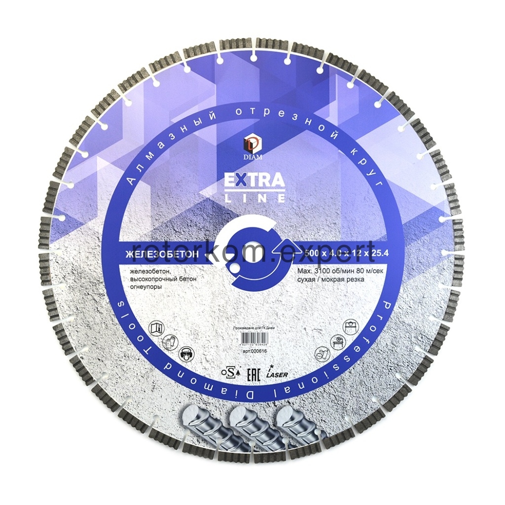 Сегментный алмазный диск по железобетону Diam Extra Line с лазерной сваркой сегментов предназначен для резки армированного бетона, железобетона, старого высокопрочного бетона, огнеупоров и других твердых материалов. Выпускается диаметром 500 мм с посадочным отверстием 25,4 мм для работы на бензорезах, резчиках швов и другом оборудовании.