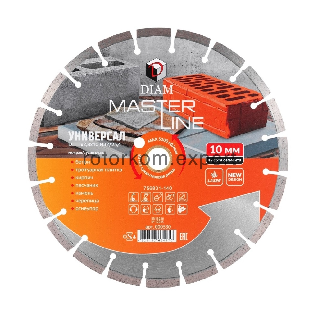 Универсальный сегментный алмазный диск Diam Master Line с лазерной сваркой сегментов предназначен для резки бетона, тротуарной плитки, кирпича, черепицы, песчаника, природного и искусственного камня, строительных материалов общего назначения. Выпускается диаметром 350 мм с посадочным отверстием 32 / 25,4 мм для работы на бензорезах, резчиках швов, станках и другом оборудовании.