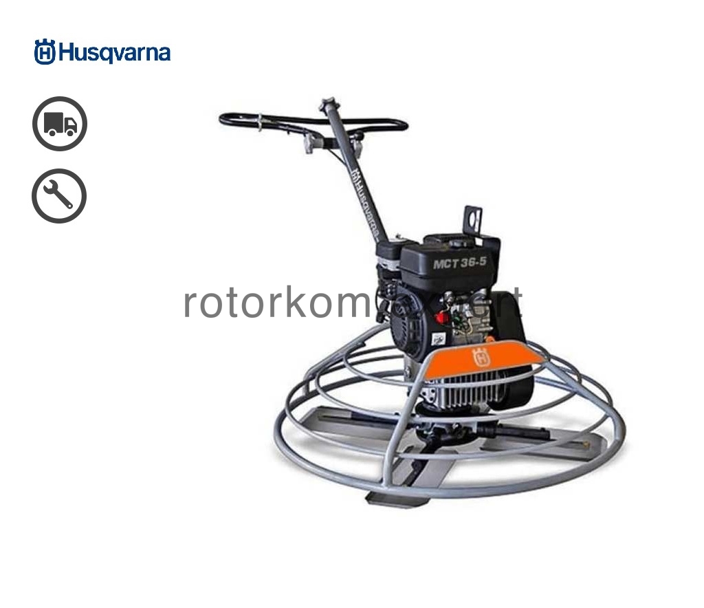Husqvarna MCT 36-5 затирочная машина бензиновая для бетона цена, сервис, запчасти от официального дилера. Husqvarna MCT 36-5 одна из самых ходовых затирочных машин на рынке и выпускается с надежным двигателем Loncin G200F. Разработанная по самым современным технологиям, бензиновая затирочная машина Husqvarna MCT 36-5, управляемая идущим сзади оператором, сочетает в себе высокое качество затирки поверхности и улучшенную защиту оператора благодаря прочному защитному кожуху. Применяется при строительных работах на открытых объектах с площадью до 500 кв.м. на черновой и чистовой обработке бетонных поверхностей. Регулируемая ручка угла наклона лопастей, регуляция высоты ручки, ее эргономика - все это позволяет оператору легко и просто управлять ей, а встроенная петля удобна при транспортировке. Агрегат поставляется с 4 лопастями и фиксированной рукояткой в комплекте.