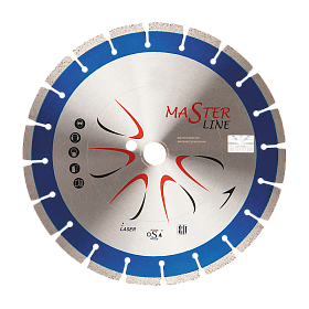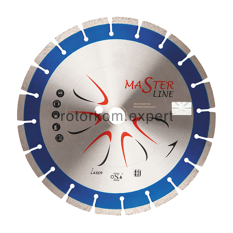 Сегментный алмазный диск по железобетону Diam Master Line с лазерной сваркой сегментов предназначен для резки армированного бетона и тротуарной плитки. Выпускается диаметром 350 мм с посадочным отверстием 25,4 мм для работы на бензорезах, резчиках швов, станках и другом оборудовании.