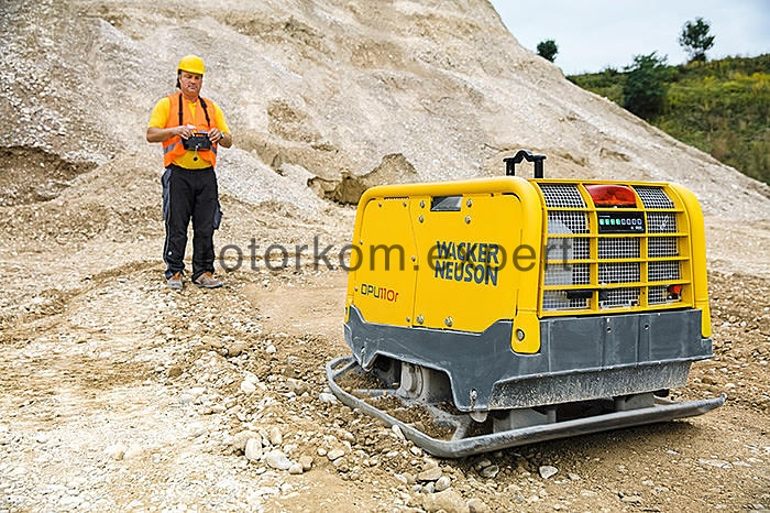 Виброплита дизельная Wacker Neuson DPU 110r Lem (масса 810 кг, сила 110 kN, дизель Kohler) с дистанционным управлением, благодаря инновационному методу управления эксцентриком позволяет чутко управлять ей без снижения скорости движения. Это обеспечивает максимальную простоту эксплуатации для оператора и позволяет осуществлять точное управление направлением движения. Безопасное расстояние до машины защищает оператора от шума и выхлопных газов. Инфракрасное дистанционное управление обеспечивает оптимальную безопасность. Виброплита мгновенно отключается при потере визуального контакта. Являясь одной из моделей дизельных виброплит, DPU110r относится к самым мощным тяжелым виброплитам в своем классе.